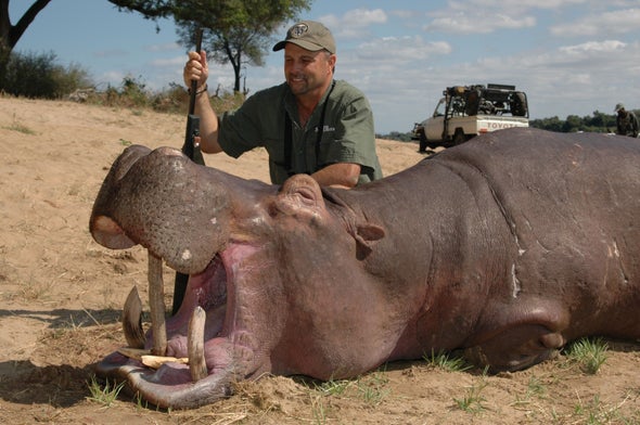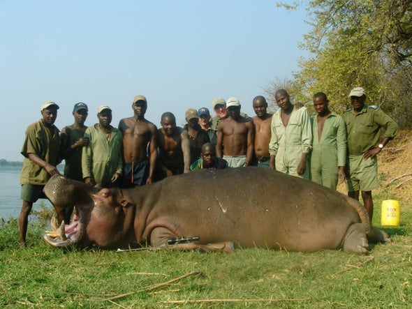 You and your professional hunter better both get busy with backup shots wherever you can hit him, because the time for pinpoint accuracy has long passed. Fail, and you will pay the trophy fee and leave a potential killer loose on the river for the next guy who comes along. Take your time and do it right for everyone's sake! If you brained the hippo, the gases in his stomach will float the carcass usually between one and three hours. Once located, a boat team will secure the carcass and tow it to a location where it can be winched on shore by the PH's vehicle.